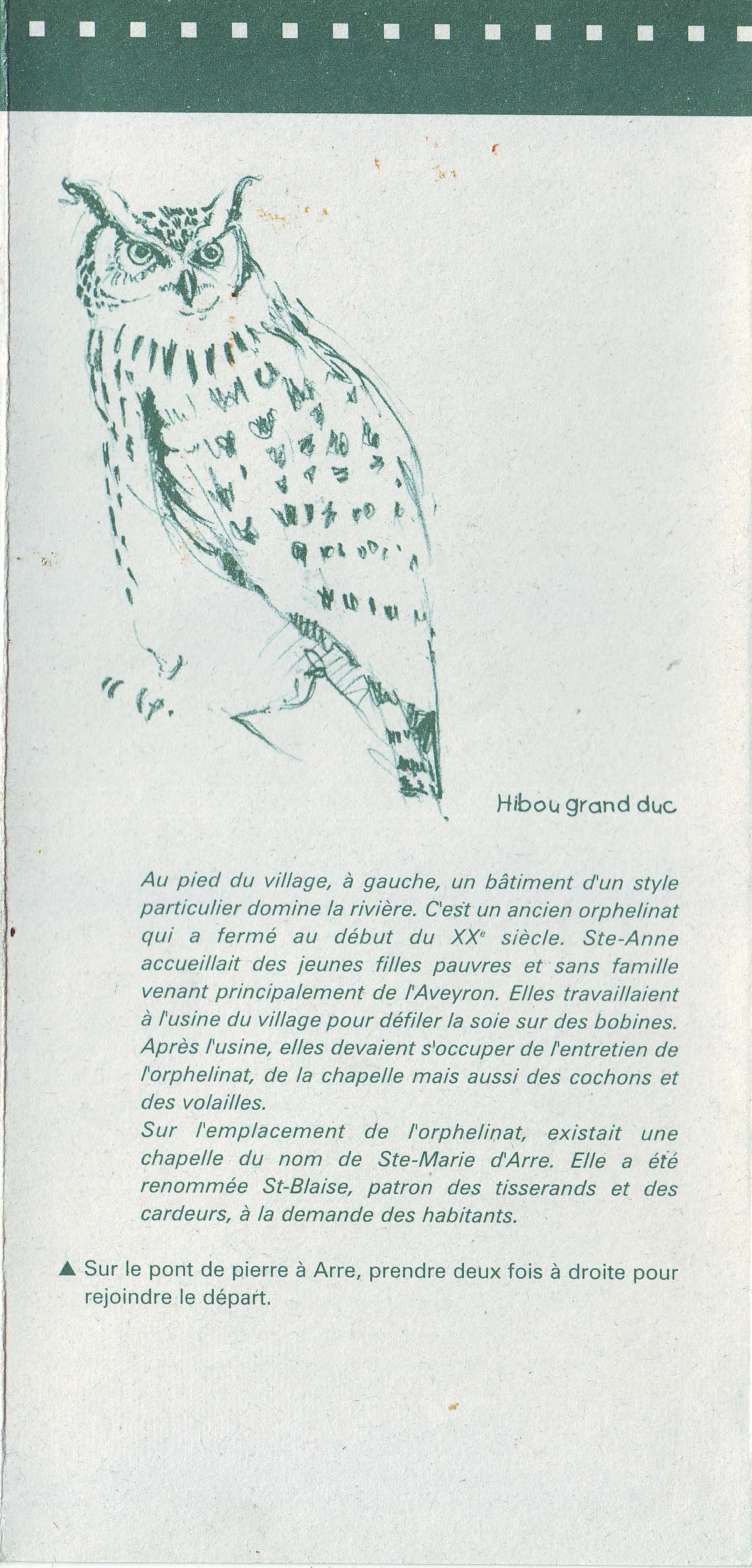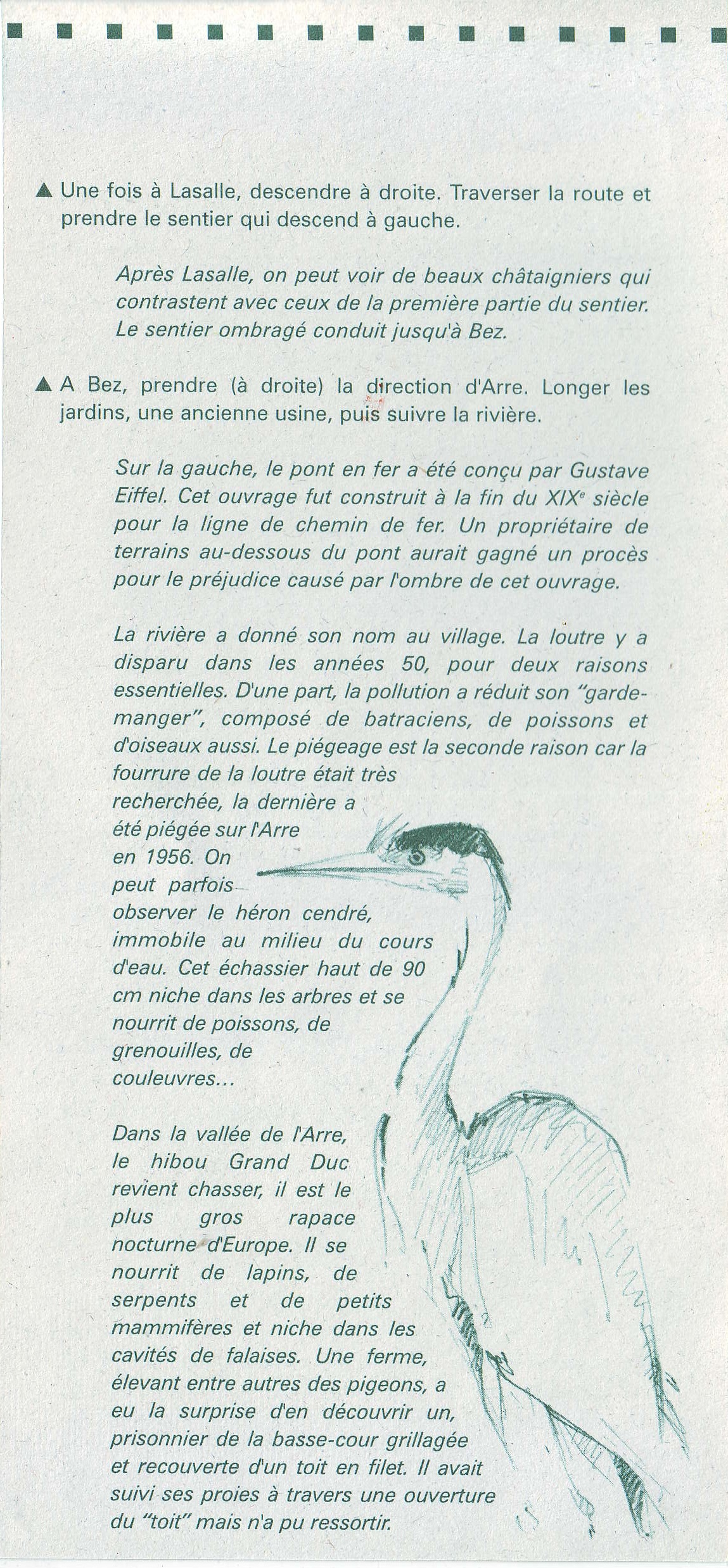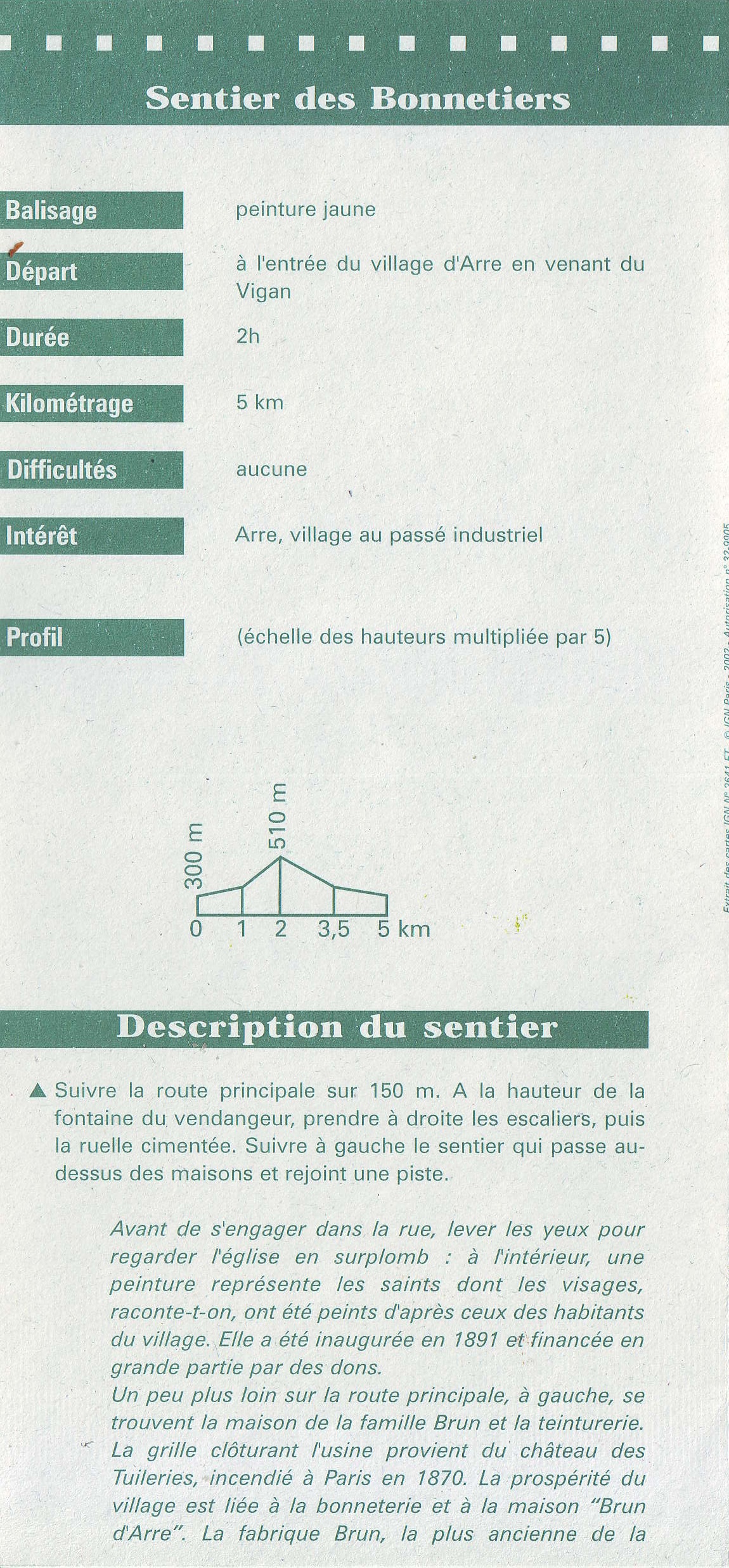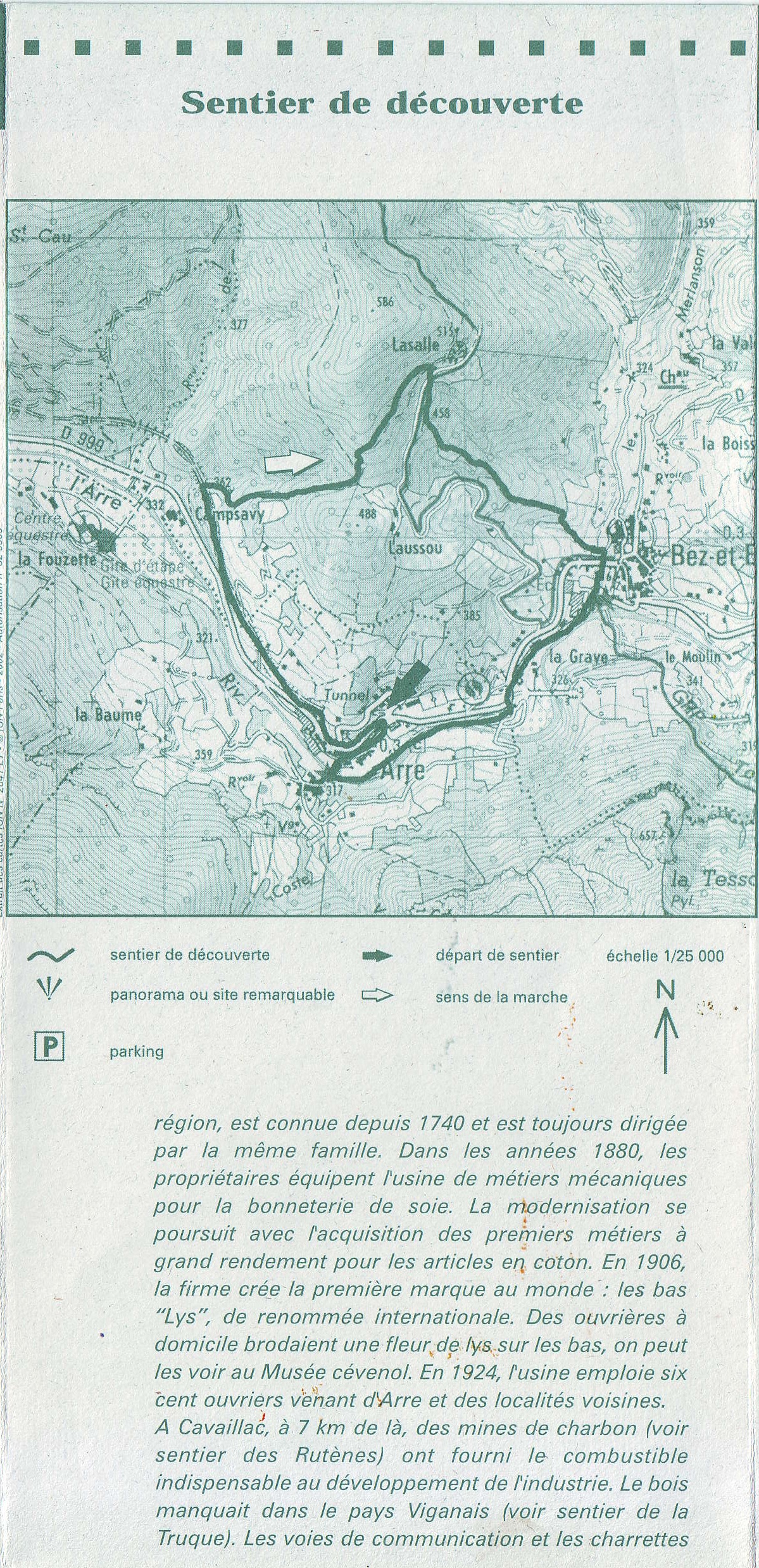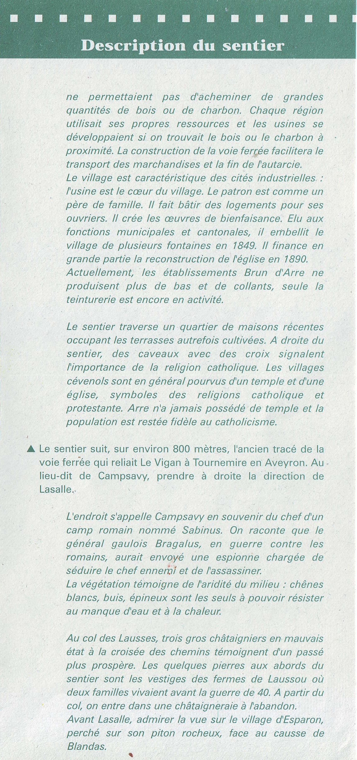 Ci-dessous un descriptif d’un de ces parcours au départ de notre commune d’Arre : « le sentier des bonnetiers » (boucle n°4 du guide 13 « Sentiers de découverte en Pays Viganais, vallées de l’Arre et du Coudoulous »).