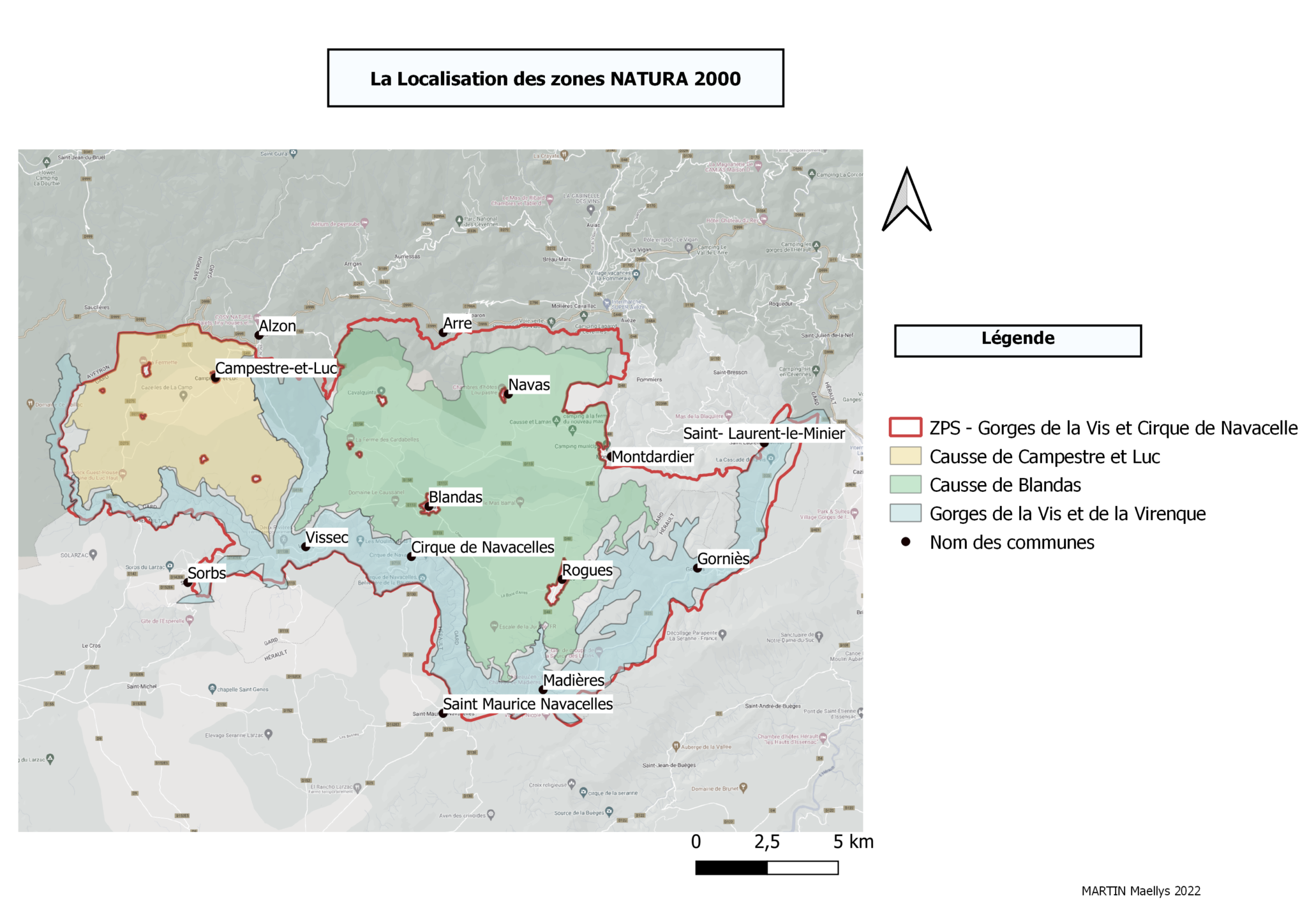 Communes concernées par le site Natura 2000 « Gorges de la Vis et Cirque de Navacelles » : Alzon, Arre, Arrigas, Bez-et-Esparon, Blandas, Campestre-et-Luc, Molières-Cavaillac, Montdardier, Pommiers, Rogues, Saint-Laurent-le-Minier, Vissec.